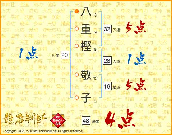 八(8画)重(9画)樫(15画) 敬(13画)子(3画)