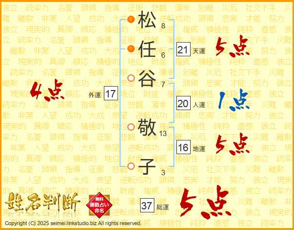 松(8画)任(6画)谷(7画) 敬(13画)子(3画)