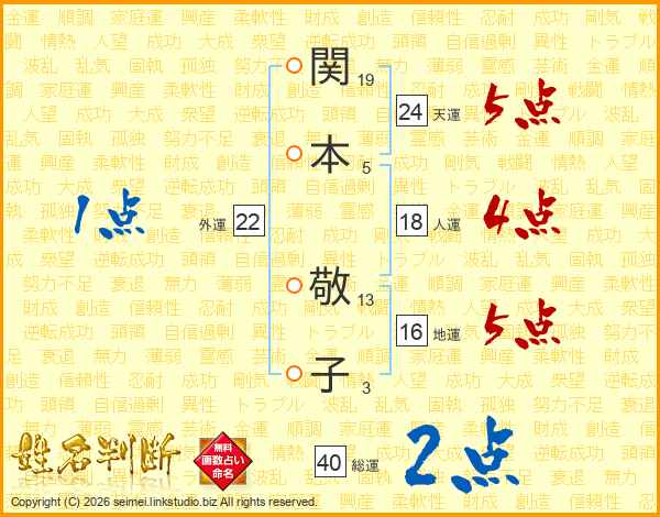 関(19画)本(5画)  敬(13画)子(3画)