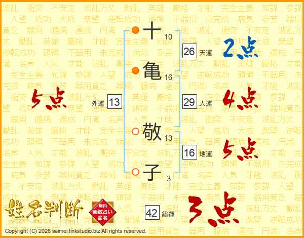 十(10画)亀(16画) 敬(13画)子(3画)