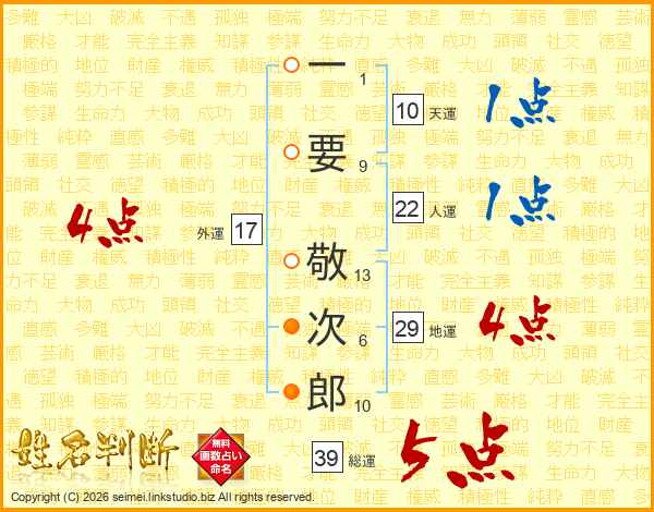 一(1画)要(9画) 敬(13画)次(6画)郎(10画)