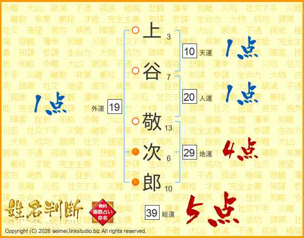 上(3画)谷(7画) 敬(13画)次(6画)郎(10画)