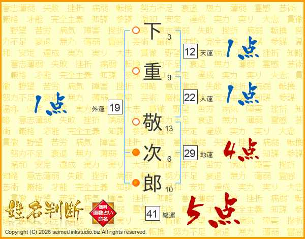 下(3画)重(9画) 敬(13画)次(6画)郎(10画)