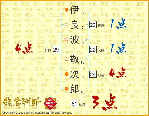 伊(6画)良(7画)波(9画) 敬(13画)次(6画)郎(10画)