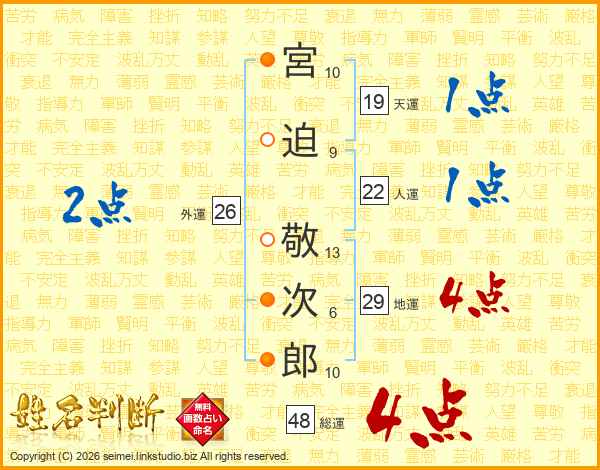 宮(10画)迫(9画) 敬(13画)次(6画)郎(10画)