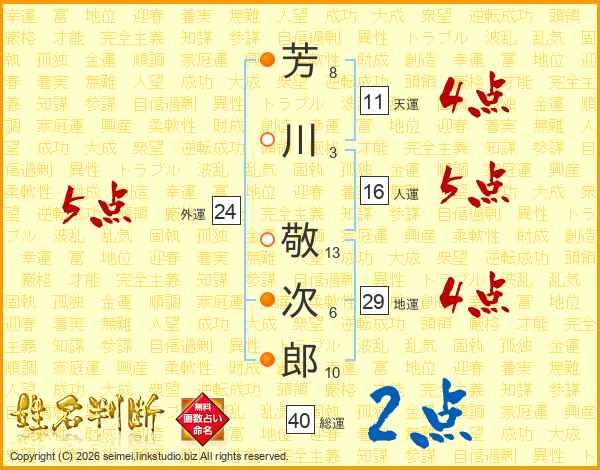 芳(8画)川(3画) 敬(13画)次(6画)郎(10画)