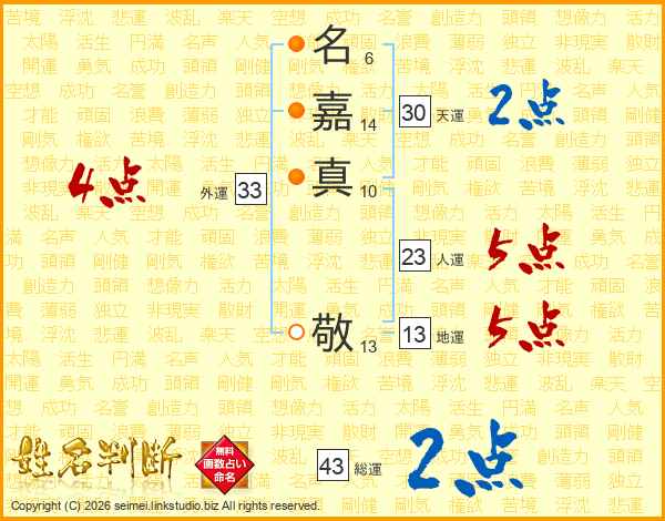 名(6画)嘉(14画)真(10画) 敬(13画)