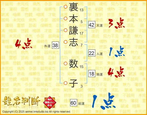 裏(13画)本(5画)謙(17画)志(7画) 数(15画)子(3画)