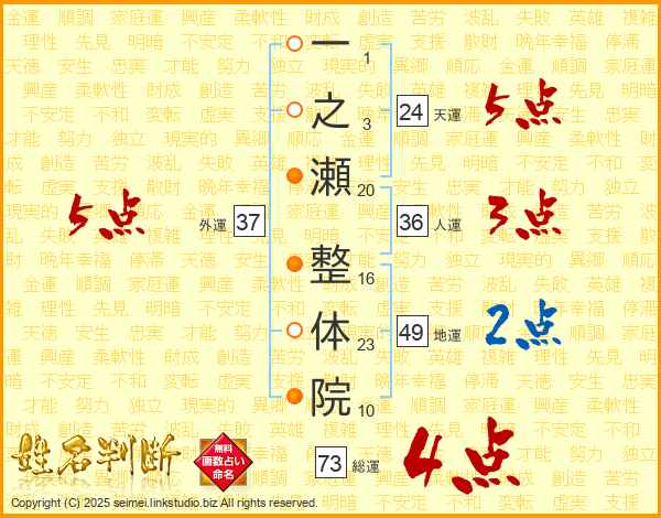 一(1画)之(3画)瀬(20画) 整(16画)体(23画)院(10画)