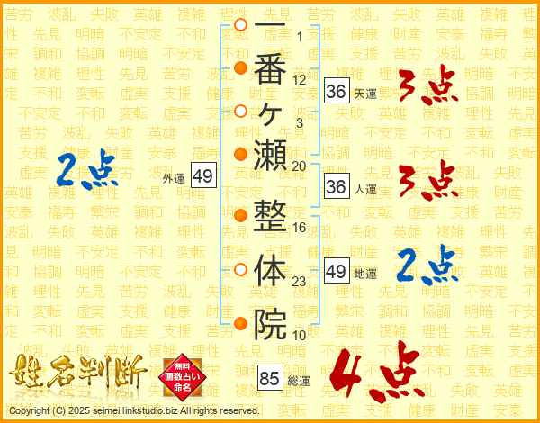 一番ヶ瀬整体院さんの総運は85画の4点!