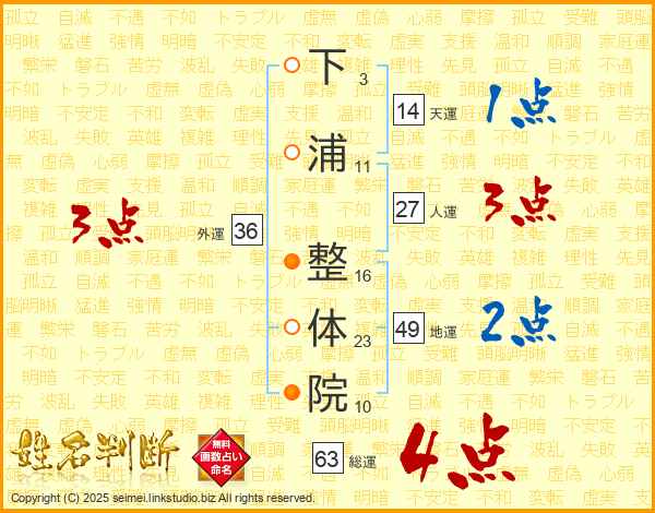 生活面を象徴する運勢です。外部から受ける影響力を表し、結婚運、家庭運や職場、環境への順応性を表します。総運から人運を引いた画数。姓や名が1文字の場合を除く。