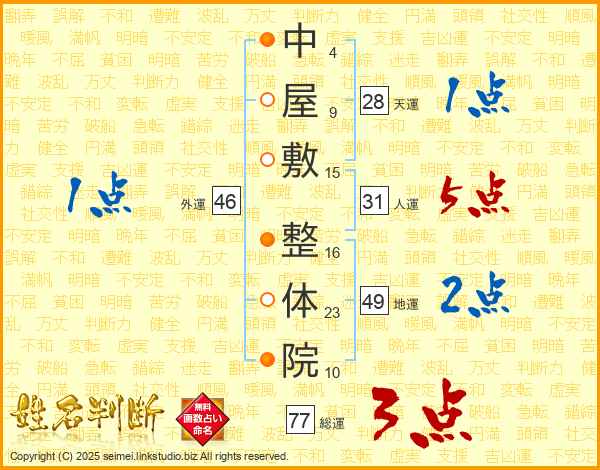 生活面を象徴する運勢です。外部から受ける影響力を表し、結婚運、家庭運や職場、環境への順応性を表します。総運から人運を引いた画数。姓や名が1文字の場合を除く。