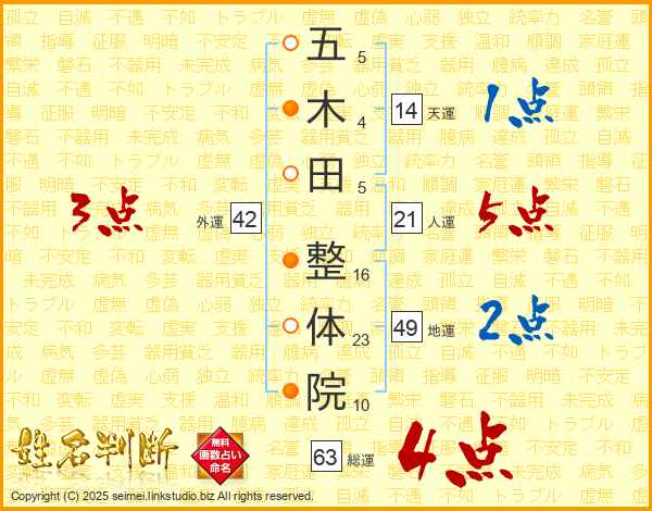 生活面を象徴する運勢です。外部から受ける影響力を表し、結婚運、家庭運や職場、環境への順応性を表します。総運から人運を引いた画数。姓や名が1文字の場合を除く。