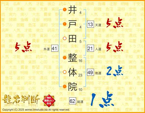 井(4画)戸(4画)田(5画) 整(16画)体(23画)院(10画)