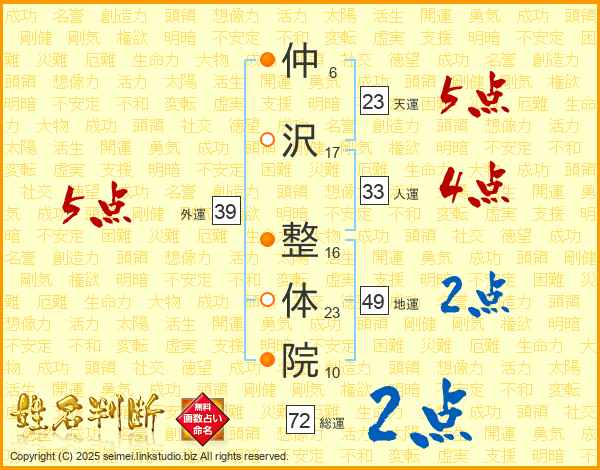 仲(6画)沢(17画) 整(16画)体(23画)院(10画)