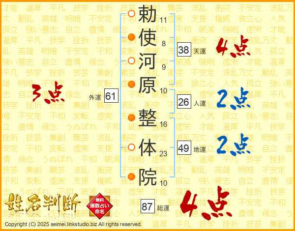 勅使河原整体院さんの天運は38画の4点!