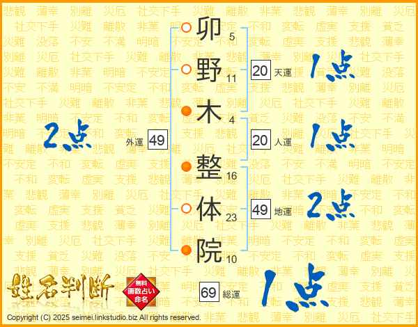 生活面を象徴する運勢です。外部から受ける影響力を表し、結婚運、家庭運や職場、環境への順応性を表します。総運から人運を引いた画数。姓や名が1文字の場合を除く。