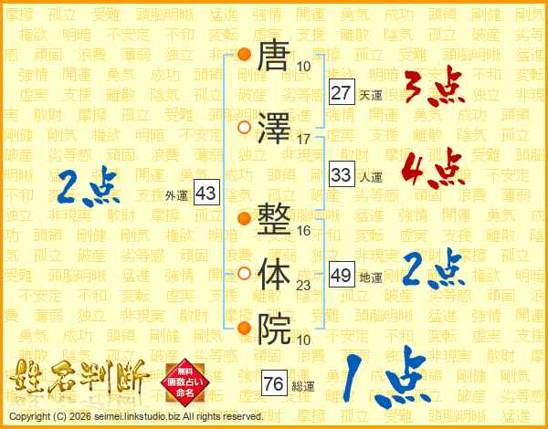 唐(10画)澤(17画) 整(16画)体(23画)院(10画)