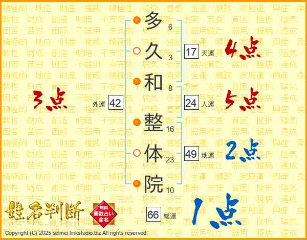 多(6画)久(3画)和(8画) 整(16画)体(23画)院(10画)