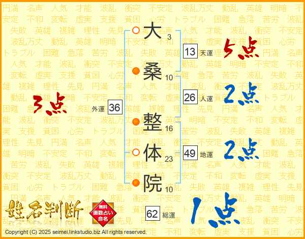 生活面を象徴する運勢です。外部から受ける影響力を表し、結婚運、家庭運や職場、環境への順応性を表します。総運から人運を引いた画数。姓や名が1文字の場合を除く。
