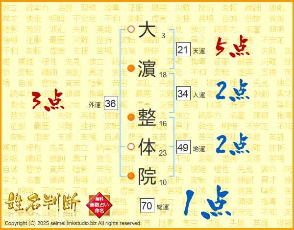 あなたの人生を表す1番重要な運勢です。生涯を通じて影響する総合運となり、主に50歳以降の晩年期に影響を及ぼします。苗字と名前の合計画数。