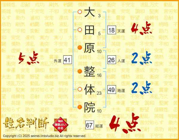 あなたの人生を表す1番重要な運勢です。生涯を通じて影響する総合運となり、主に50歳以降の晩年期に影響を及ぼします。苗字と名前の合計画数。
