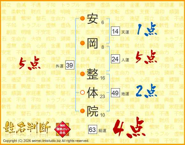 安(6画)岡(8画) 整(16画)体(23画)院(10画)