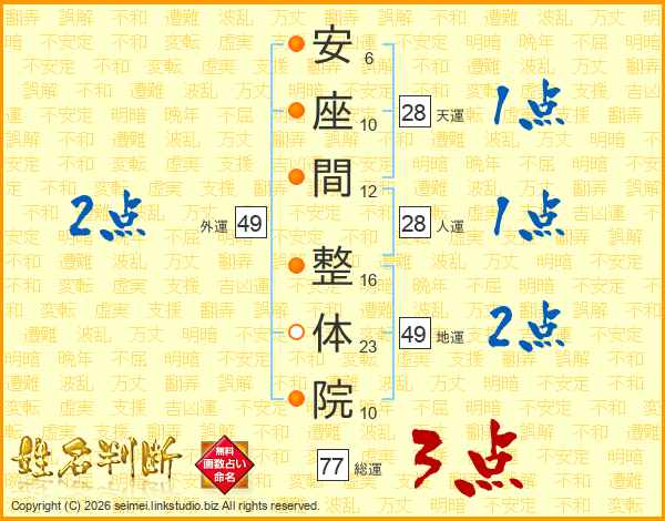 安(6画)座(10画)間(12画) 整(16画)体(23画)院(10画)