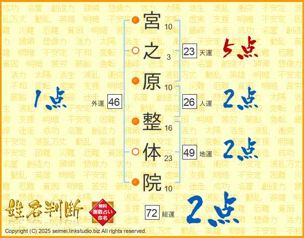 宮(10画)之(3画)原(10画) 整(16画)体(23画)院(10画)