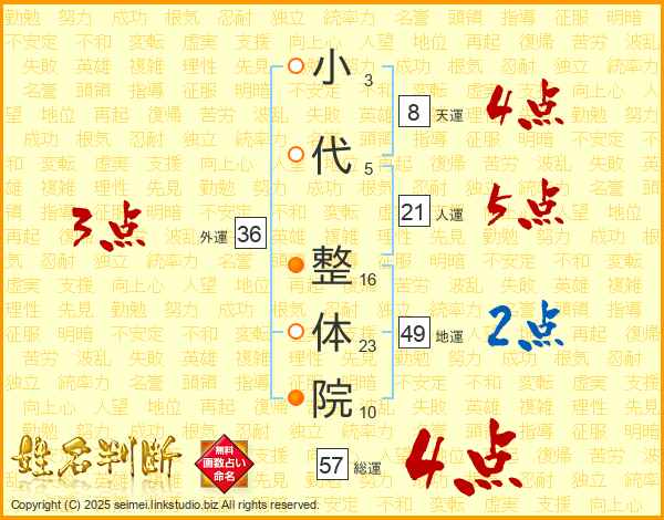 あなたの人生を表す1番重要な運勢です。生涯を通じて影響する総合運となり、主に50歳以降の晩年期に影響を及ぼします。苗字と名前の合計画数。