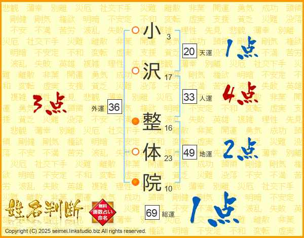 小(3画)沢(17画) 整(16画)体(23画)院(10画)