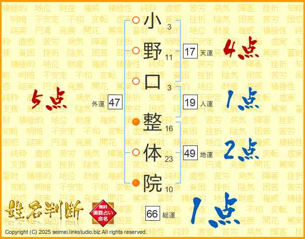 画数の奇数(○陽)と偶数(●陰)の配列で吉凶を占います。どちらかにかたよる名前は大凶名で避ける必要があります。画数の奇数偶数。