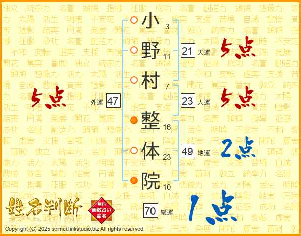 小(3画)野(11画)村(7画) 整(16画)体(23画)院(10画)