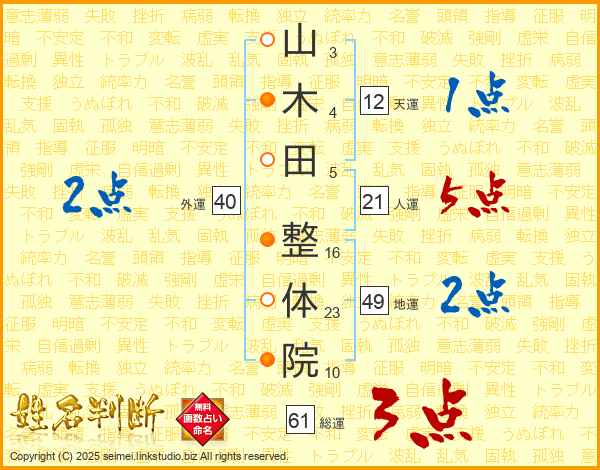 山(3画)木(4画)田(5画) 整(16画)体(23画)院(10画)
