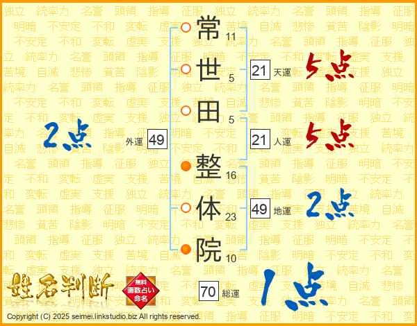 生活面を象徴する運勢です。外部から受ける影響力を表し、結婚運、家庭運や職場、環境への順応性を表します。総運から人運を引いた画数。姓や名が1文字の場合を除く。