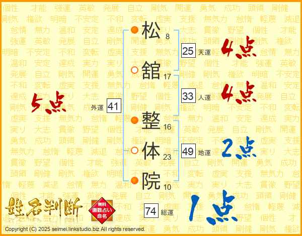 松(8画)舘(17画) 整(16画)体(23画)院(10画)