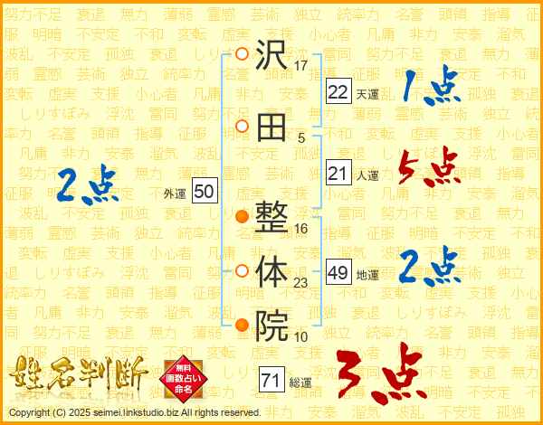 沢(17画)田(5画) 整(16画)体(23画)院(10画)