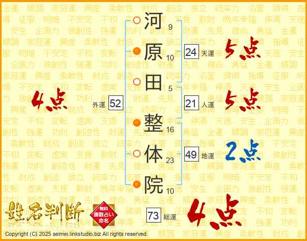 河(9画)原(10画)田(5画) 整(16画)体(23画)院(10画)
