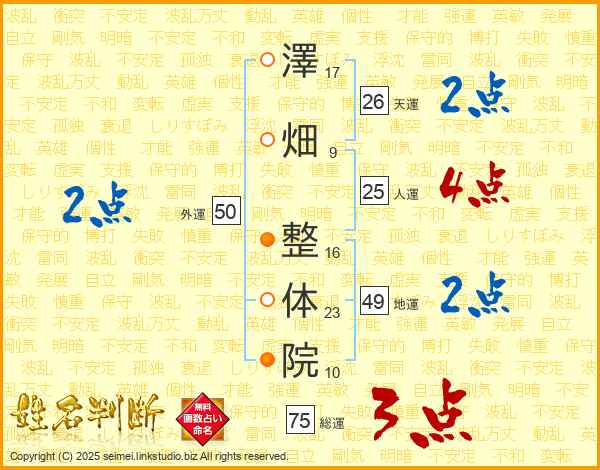 澤(17画)畑(9画) 整(16画)体(23画)院(10画)