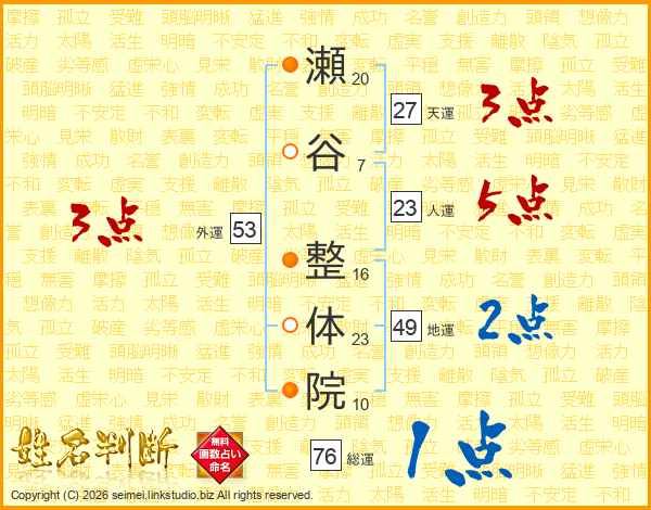瀬(20画)谷(7画) 整(16画)体(23画)院(10画)