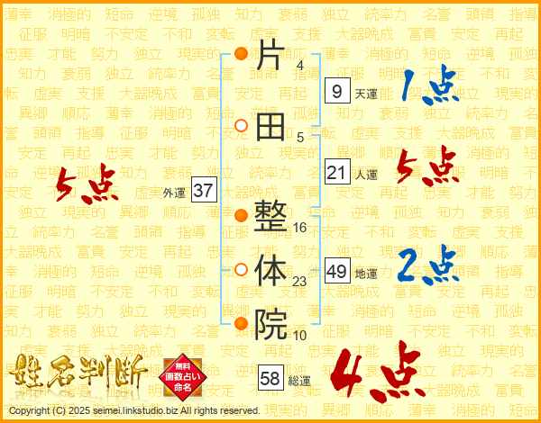 あなたの人生を表す1番重要な運勢です。生涯を通じて影響する総合運となり、主に50歳以降の晩年期に影響を及ぼします。苗字と名前の合計画数。