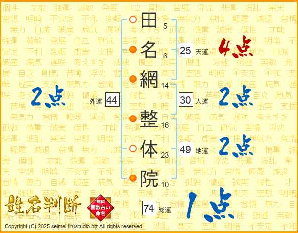 田(5画)名(6画)網(14画) 整(16画)体(23画)院(10画)