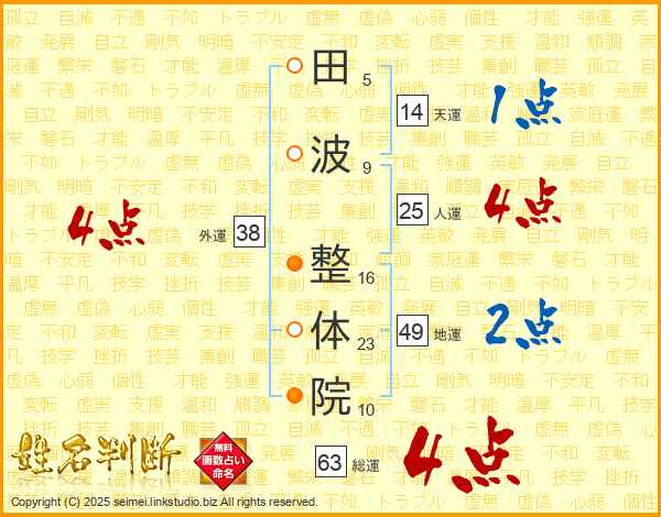 生活面を象徴する運勢です。外部から受ける影響力を表し、結婚運、家庭運や職場、環境への順応性を表します。総運から人運を引いた画数。姓や名が1文字の場合を除く。