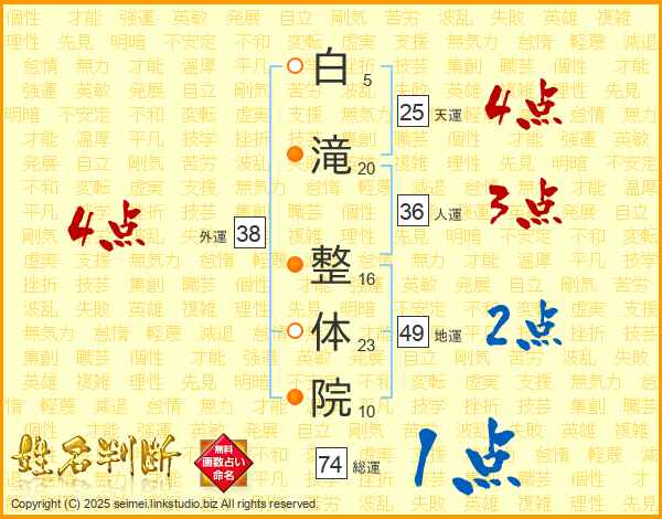 白(5画)滝(20画) 整(16画)体(23画)院(10画)