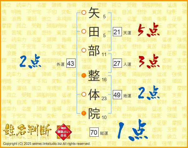 生活面を象徴する運勢です。外部から受ける影響力を表し、結婚運、家庭運や職場、環境への順応性を表します。総運から人運を引いた画数。姓や名が1文字の場合を除く。