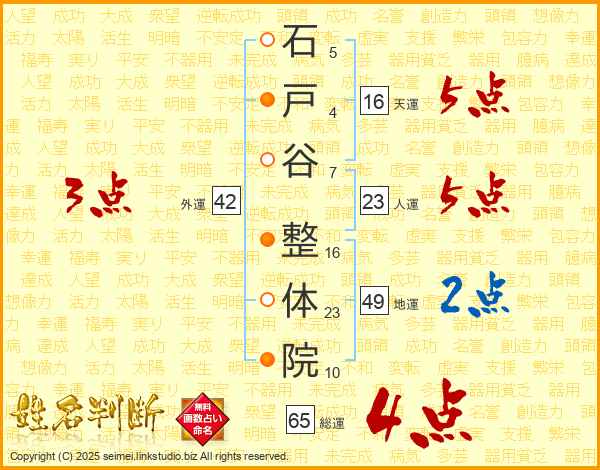 石(5画)戸(4画)谷(7画) 整(16画)体(23画)院(10画)