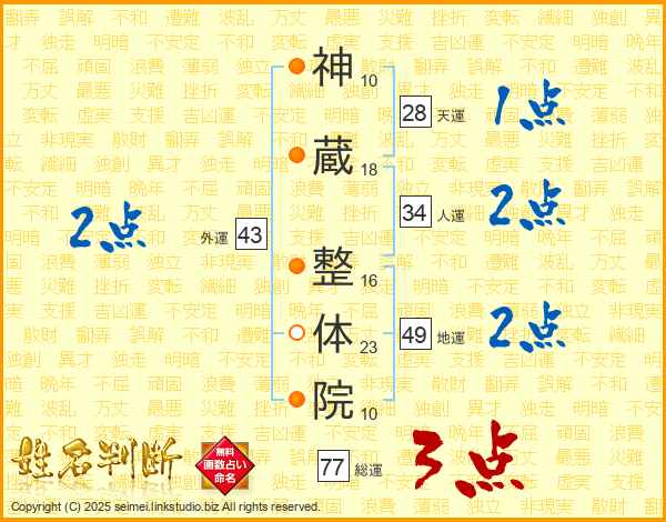 神(10画)蔵(18画) 整(16画)体(23画)院(10画)