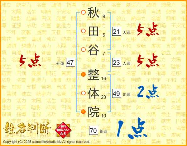 秋(9画)田(5画)谷(7画) 整(16画)体(23画)院(10画)