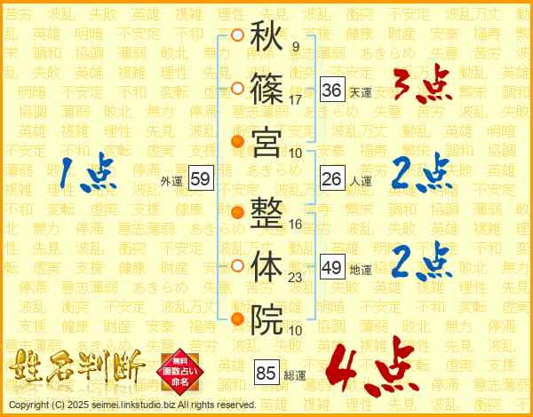 秋(9画)篠(17画)宮(10画) 整(16画)体(23画)院(10画)