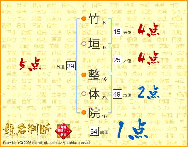 竹(6画)垣(9画) 整(16画)体(23画)院(10画)